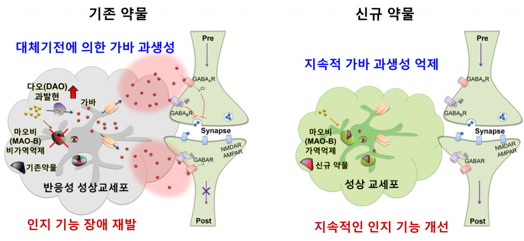 KIST 연구진은 기존 약물들은 초기에는 가바의 양을 줄여줘 인지기능을 개선시킬 수 있었지만 장기간 투여 시 생체 내 대체기전이 작동하기 시작하면서 가바의 양이 다시 증가하고 인지 장애가 다시 생긴다는 사실을 규명했다. KIST 연구진이 개발한 후보약물은 장기간 투여 시에도 이 같은 대체기전을 작동시키지 않아 장기간 지속적으로 인지기능을 개선시킬 수 있음을 확인했다. 또한 알츠하이머병에 걸린 유전자 변이 실험용 쥐에 투여해 다양한 행동실험을 통해 인지기능이 회복된 것을 확인했을 뿐 아니라, 적은 용량으로 장기간 투여한 시험에서도 월등한 인지기능 개선 효능을 입증했다.