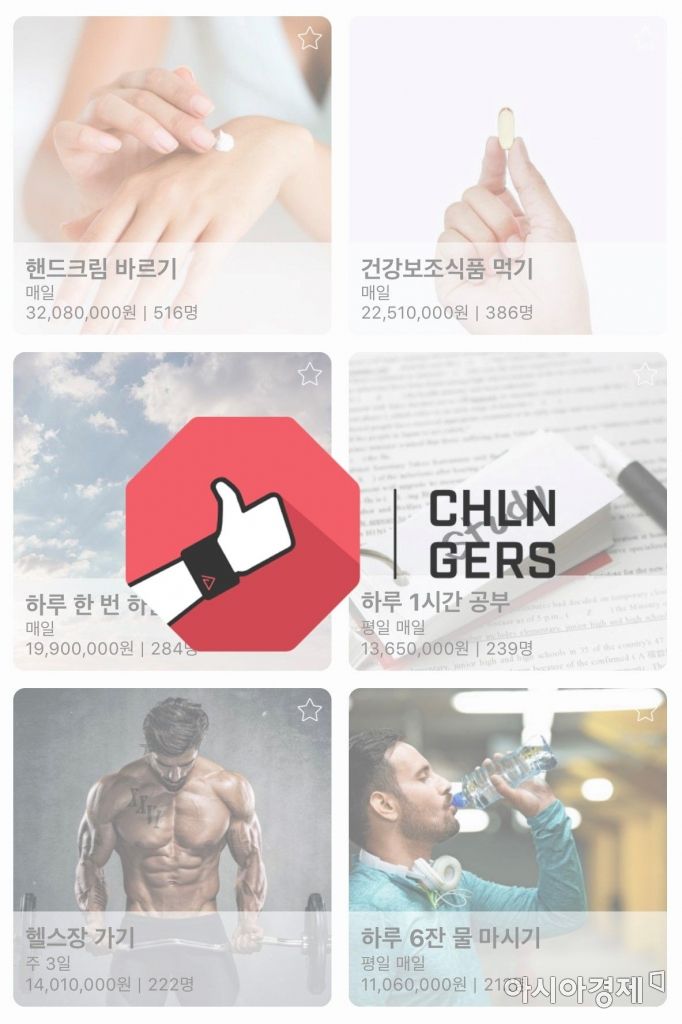 챌린저스는 이용자들이 원하는 목표를 달성하도록 도와주는 앱이다. ‘1만보 걷기’, ‘종이신문 읽기’, ‘TED 강연보기’ 등 170여 건의 프로젝트가 등록 돼 있다. 참가자들은 목표달성을 위해 소액의 돈을 걸고 프로젝트에 참여할 수 있다.