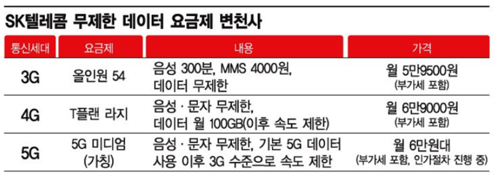 ◆기본 5G 데이터 사용뒤, 3G 수준으로 속도제한 유력= SK텔레콤 관계자는 "(5만원대) 5G 중저가 요금제를 실제 소비자들이 이용하려면 5G 데이터 용량을 소진한 뒤에도 데이터를 계속 쓸 수 있어야 해 속도를 늦추돼 데이터는 무제한으로 제공하기로 했다"면서 "속도 제한을 4G 수준으로 할지 3G 수준으로 할지는 과기정통부와 요금 인가 과정에서 논의할 계획"이라고 밝혔다.