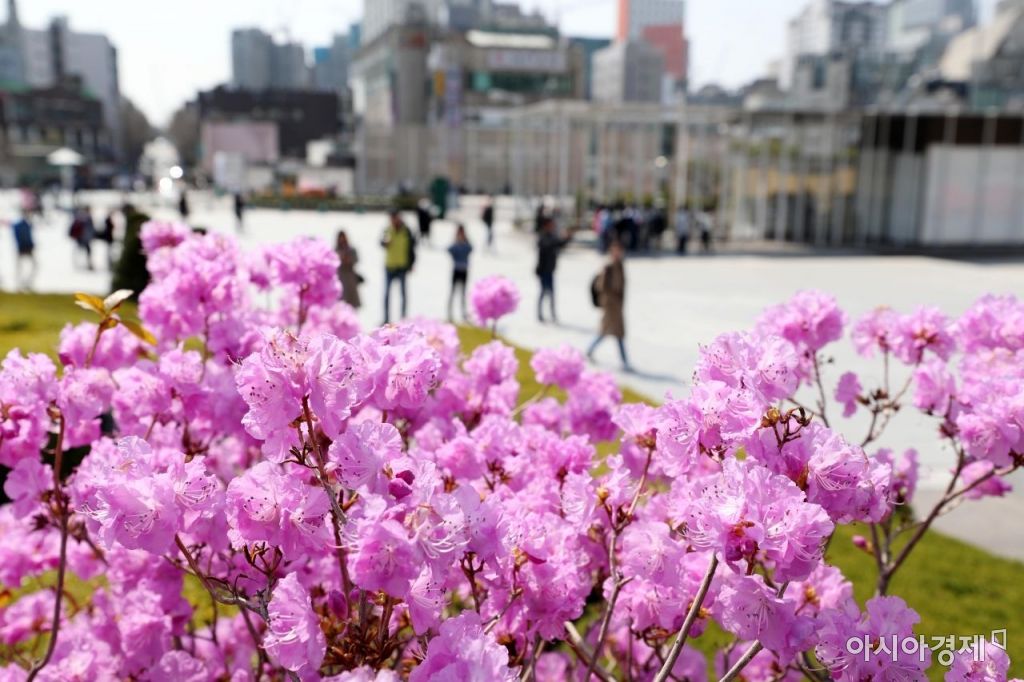 포근한 봄 날씨를 보인 29일 진달래꽃이 만개한 서울 서대문구 이화여자대학교에서 시민들이 산책을 하고 있다. /문호남 기자 munonam@