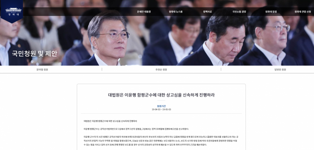 청와대 국민청원에 올라온 사연은 “이윤행 군수의 이 사건 범행은 공직선거법의 취지에 반해 유권자들의 판단이 후보자의 자질과 능력이 아닌 금품에 영향을 받게 함으로써 유능하고 훌륭한 대표자를 선출하고자 하는 공직선거의 본질적 기능이 무력화 될 위험을 발생시켰다”며, “오늘날 신문과 방송 같은 언론매체는 보도내용이나 논조, 보도의 시기와 방법 등에 따라 유권자들에게 광범위한 영향을 미칠 수 있는 힘을 가지고 있어 선거 등에 관해 편향된 보도를 할 경우 선거의 공정성이 심각하게 훼손될 수 있도록 해 민주주의의 근간을 훼손했다”고 주장했다.