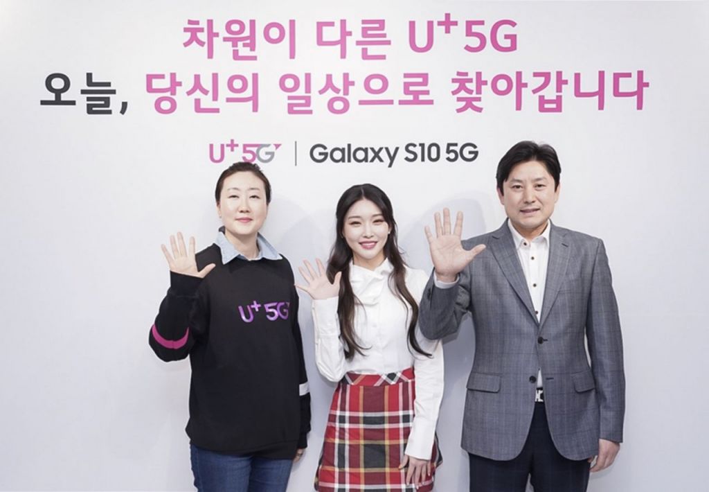 4일(목) 강남역 U+5G 팝업스토어 ‘일상로5G길’에서 진행된 세계 최초 5G스마트폰 삼성전자 ‘갤럭시 S10 5G’ 개통 전야제에 참석한 가수 청하가 LG유플러스 마케팅그룹장 김새라 상무(사진 왼쪽)와 삼성전자 IM영업3그룹장 최영 상무와 함께 기념촬영을 하고 있다.