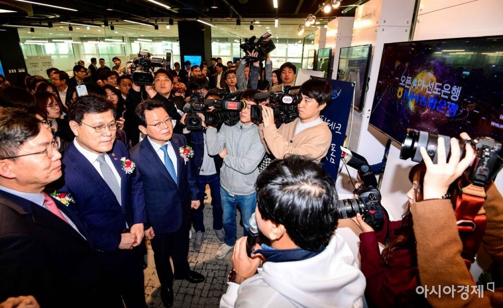 최종구(왼쪽 두 번째) 금융위원회 위원장이 8일 서울 서초구 NH농협은행 IT센터에서 열린 'NH디지털혁신캠퍼스 출범식'에 참석해 오픈 API에 대해 설명 듣고 있다./강진형 기자aymsdream@