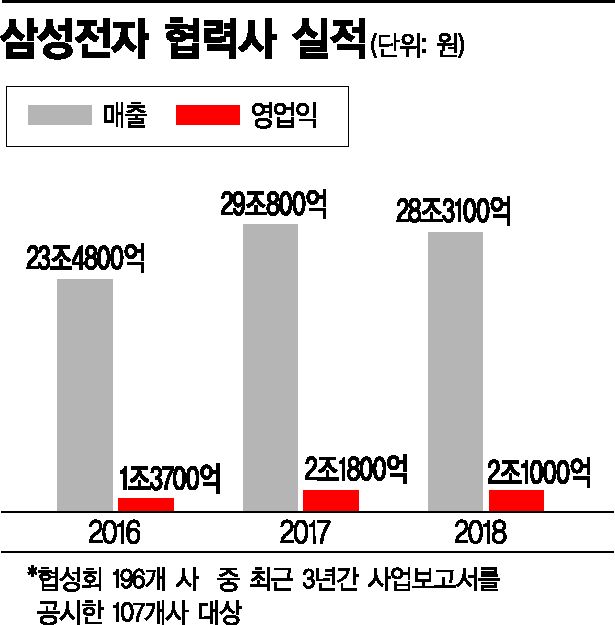 8일 아시아경제가 삼성전자 1차 협력사 모임인 협성회 196개 중 최근 3년간(2016~2018) 실적을 공시한 107개 업체들의 사업보고서를 분석한 결과, 지난해 총 매출 28조3100억원, 영업이익 2조1000억원을 기록한 것으로 나타났다. 2017년 대비 매출은 2.7%, 영업이익은 3.6%씩 줄었다. 107개 업체 중 영업이익이 줄어든 업체는 55개(52%)에 달했다.
