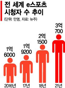 ◆e스포츠의 인기로 '보는 게임' 부상=방치형 게임의 부상은 e스포츠가 게임을 즐기는 방법으로 자리를 잡으면서 게임을 플레이하는 영상을 보는 것만으로도 충분히 재미와 만족감을 느끼는 사용자들이 증가하고 있는 것과도 관련이 있는 것으로 분석된다. 실제로 글로벌 게임시장 조사업체 뉴주에 따르면 지난해 e스포츠를 시청한 글로벌 시청자 수는 총 2억1500만 명으로 추정됐다. 이는 2016년 1억6000만 명에 비해 34%, 2017년 1억9200만 명과 비교했을 때는 12% 증가한 수치다. 또 e스포츠 시청자 수는 2016년부터 2021년까지 연평균 성장률 14.4%를 보이며 2021년 3억 명을 돌파할 것으로 전망된다. 이 같이 증가하는 e스포츠 시청자가 '보는 게임'의 수요를 창출했고 이는 방치형 게임 장르의 인기로 이어지고 있다는 얘기다.