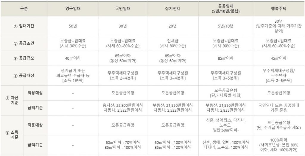 다양한 기준이 유형별로 다르게 적용되기 때문에 공공임대주택을 노린다면 자신의 소득 상황과 향후 주택 마련 계획 등을 꼼꼼히 따져봐야 하는 이유다.