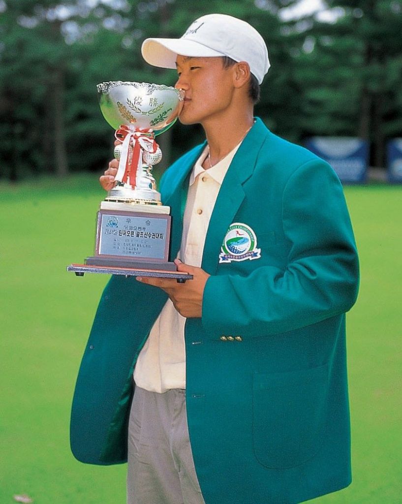 김대섭이 1998년 한국오픈에서 코리안투어 역대 최연소인 17세 2개월 20일로 우승한 뒤 트로피에 입을 맞추고 있다.