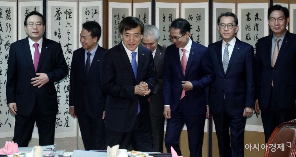 이주열 한국은행 총재(왼쪽 세 번째)와 은행장들이 26일 서울 중구 한국은행에서 열린 금융협의회에 참석, 자리로 향하고 있다./김현민 기자 kimhyun81@