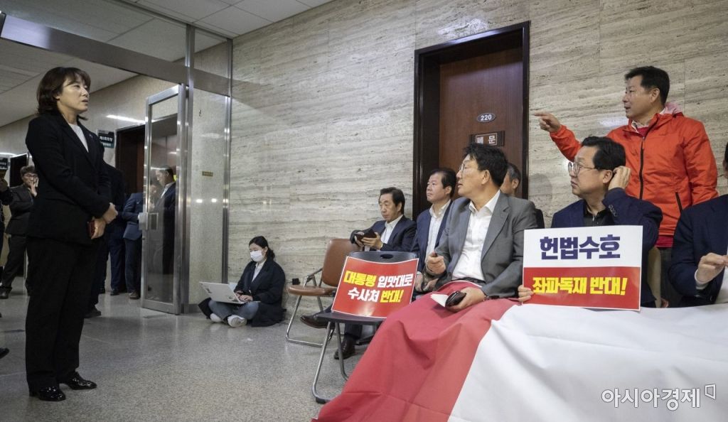 권성동, 이장우 등 자유한국당 의원이 29일 국회 특별위원회 회의실 앞에서 사진을 촬영하던 의회경호과 직원들에게 항의하고 있다. 자유한국당 의원들은 경호과 직원들이 사진을 찍은것은 '사찰'이라고 말했다./윤동주 기자 doso7@