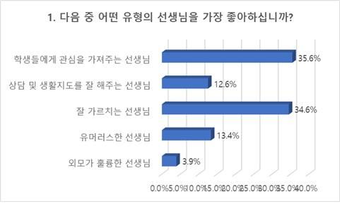 먼저 어떤 유형의 선생님을 좋아하는지에 대한 질문에 '학생들에게 관심을 가져주는 선생님'을 선택한 학생이 35.6%(181명), 잘 가르치는 선생님이 34.6%(176명)로 1~2위를 차지했다. 이어 '유머러스한 선생님(13.4%·68명)', '상담 및 생활지도를 잘해주는 선생님(12.6%·64명)', '외모가 훌륭한 선생님(3.9%·20명) 순으로 나타났다.