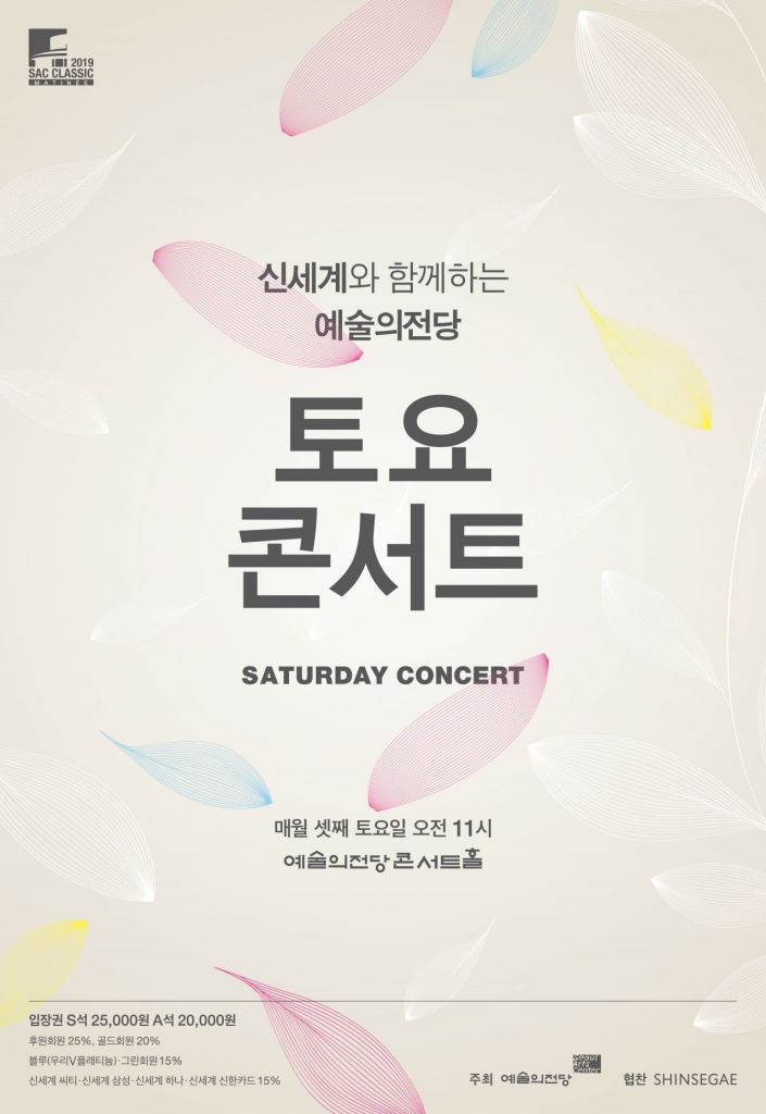 예술의전당 토요콘서트는 평일 공연 관람이 부담스러운 관객층을 대상으로 매월 셋째주 토요일 오전에 열리는 설명이 있는 음악회다. '11시 콘서트'와 함께 예술의전당을 대표하는 '마티네 콘서트'다. 협주곡과 교향곡 전곡을 감상할 수 있다는 점에서 교향곡의 특정 악장을 발췌하고 익숙한 소품으로 구성하는 '11시 콘서트'와 차별화된다. 국내 최정상급 교향악단과 최정예 협연자의 명연에 더해 지휘자의 친절한 곡 해설까지 감상할 수 있다.