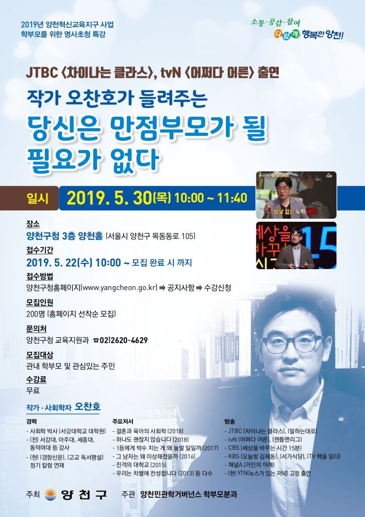 양천구 관계자는 “이번 강연을 통해 자녀 교육하는 데 있어서 중요한 가치와 자녀 교육의 방향에 대해서 다시금 고민해보는 시간이 되기를 바란다”며 “관심 있는 분들의 많은 참여를 바란다”고 말했다. 교육지원과(☎2620-4629)