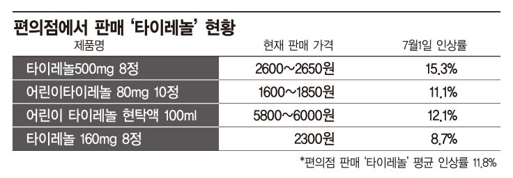 22일 한국얀센의 타이레놀 판매를 맡고 있는 한국존슨앤존슨컨슈머 관계자는 "지난 17일과 21일 걸쳐 편의점측에 공급가격 인상 공문을 발송했다"며 "인상 예정일은 7월1일"이라고 밝혔다. 공문은 공급업체를 통해 각 편의점 본사에 전달되며, 가격 인상통보가 공식으로 이뤄지면 가격 조정과 관련한 내부 논의에 나설 전망이다.