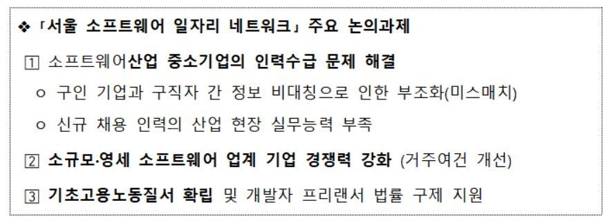 서울 소프트웨어 업종의 대표적인 일자리 문제는 구로구와 금천구 등 중소 소프트웨어기업 밀집지역의 인력수급 미스매치다.