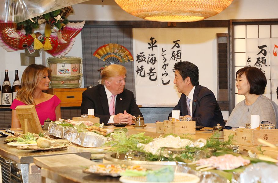 전날 아베 신조(安倍晋三) 일본 총리 부부는 방일 중인 도널드 트럼프 미국 대통령과 멜라니아 트럼프 여사를 초청해 스모 경기를 관람하고 만찬을 함께 했다. 양국 정상 부부는 도쿄의 번화가 롯폰기(六本木)에 있는 일본식 선술집 '로바다야키'에서 만찬을 함께 했다. 로바다야끼란 제철 조개류 및 고기, 야채를 손님이 보는 앞에서 화로에 구워주는 일종의 '그릴 구이'를 말한다.