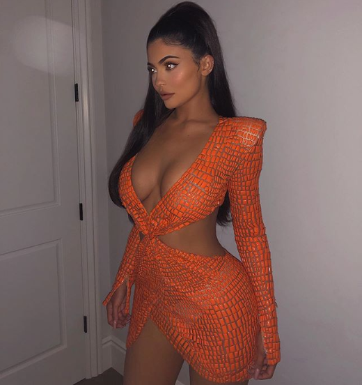 공개된 사진에서 카일리 제너는 속이 훤희 비치는 주황색 악어무늬의 원피스를 입고 굴곡있는 몸매를 과시했다.