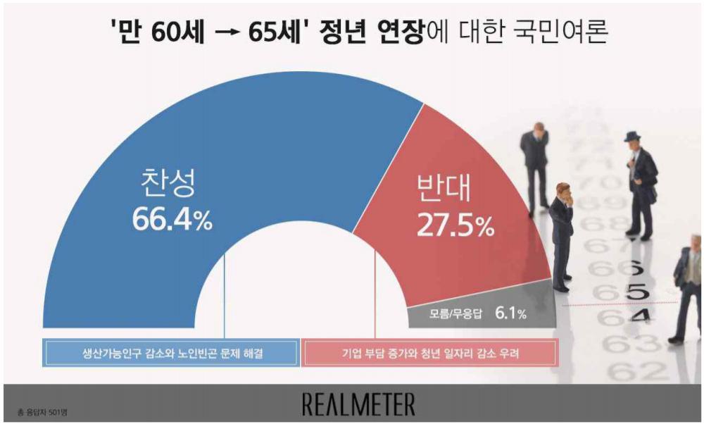 리얼미터는 오마이뉴스의 의뢰로 28일 만 65세 정년 연장에 대한 국민여론을 조사한 결과 '저출산·고령화에 따른 생산가능인구 감소, 노인빈곤 문제 해결을 위해 찬성한다'는 응답이 66.4%로 집계됐다고 29일 밝혔다. 반면 '기업의 부담이 늘어나고 청년 일자리가 줄어들 우려가 있으므로 반대한다'는 응답은 27.5%로 나타났다. '모름·무응답'은 6.1%.