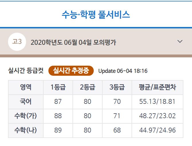 이날 공개된 등급컷 표에 따르면 국어 1등급은 87점, 2등급은 80점, 3등급은 70점이다. 수학 가형 1등급은 88점, 2등급은 80점, 3등급은 71점이며 수학 나형은 1등급 89점, 2등급 80점, 3등급 68점을 기록했다.