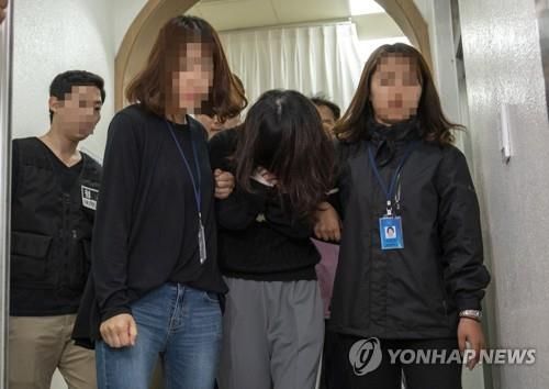 검정색 티셔츠에 회식 트레이닝복을 입고 슬리퍼 차림의 고씨는 머리를 풀고 고개를 숙인 채 빠르게 이동해 얼굴은 드러나지 않았다.