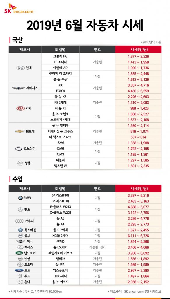 7일 SK엔카 직영 중고차 몰 SK엔카닷컴은 올해 6월 중고차 시세를 이 같이 공개했다. 이는 현대자동차, 기아자동차, 쌍용자동차 등 국내 완성차 브랜드와 BMW, 벤츠, 렉서스 등 수입 브랜드의 2016년식 주요 인기 차종에 대한 중고차 가격을 정리한 수치다.