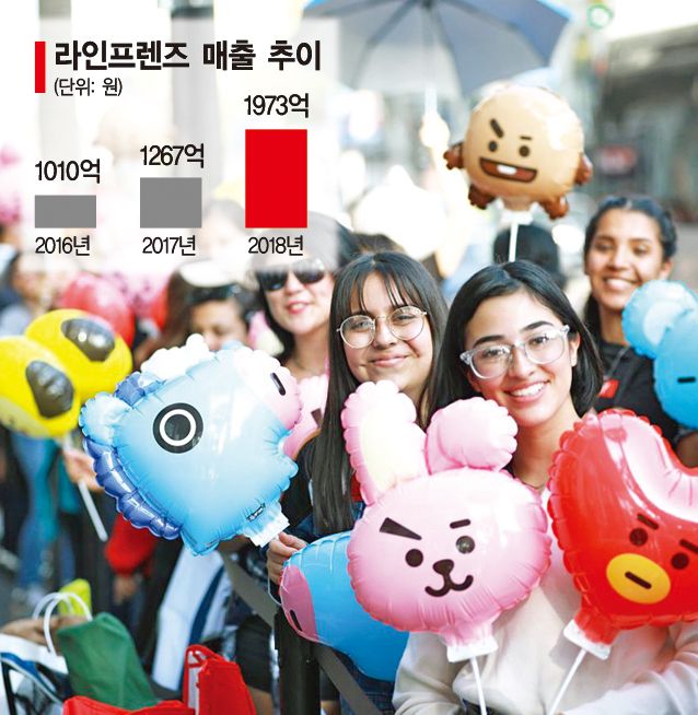 뿐만 아니라 라인프렌즈는 중국, 일본, 대만, 태국, 홍콩, 말레이시아, 싱가포르, 인도네시아, 콜롬비아, 필리핀 등에 누적 145개 매장을 열며 세계 캐릭터 시장에서 영향력을 확대하고 있다. 이를 바탕으로 매출은 2015년 독립법인으로 분사할 때 376억원에서 지난해 1973억원으로 늘었다. 분사 당시보다 다섯 배 이상 증가한 수치다.