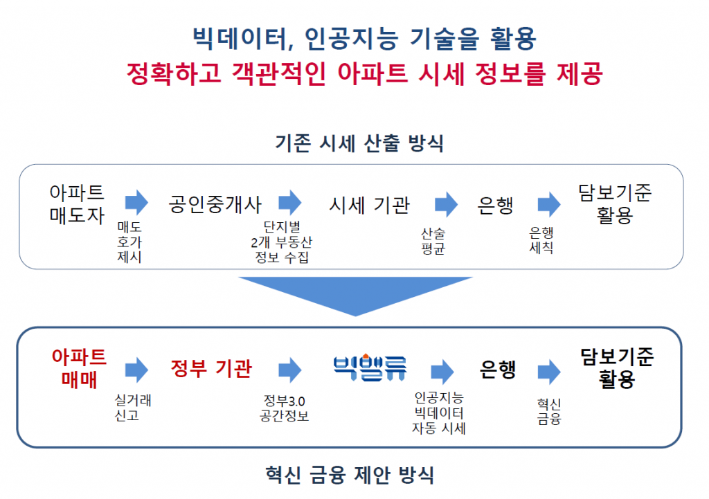 이 가운데 빅밸류와 공감랩이 제시한 빅데이터 기반 부동산 시세 자동산정 서비스가 눈길을 끌었다. 이들 업체는 공공데이터와 빅데이터, AI 알고리즘 등을 이용해 아파트와 빌라 등 부동산 시세와 담보가치를 산정한다. 현재 은행이 주택담보대출을 할 때 아파트 시세는 국세청 기준시가나 감정평가업자의 감정평가액, 한국감정원 가격, KB부동산시세 일반거래가 등을 통해 적용된다.