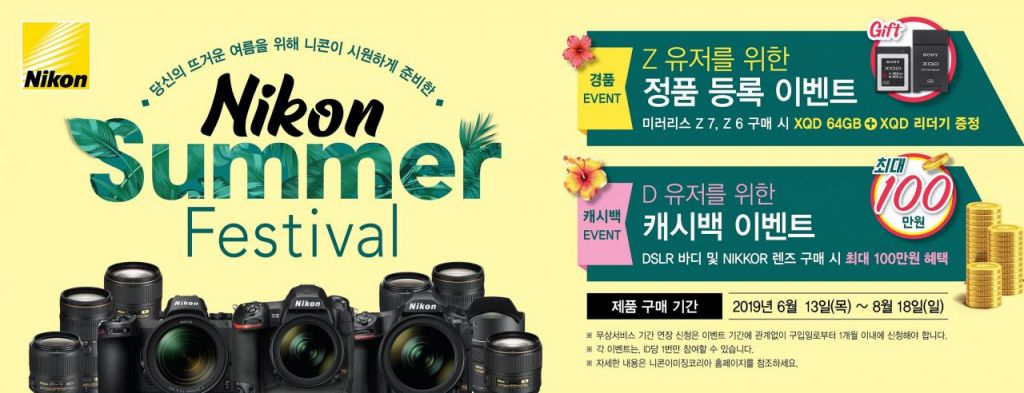 미러리스 카메라 구입 시에는 32만원 상당의 XQD 64GB 메모리카드와 리더기를 증정하고, DSLR 카메라와 전용 NIKKOR 렌즈 구매 고객에게는 캐시백 혜택을 제공한다. 캐시백 금액은 기종별로 다르며 DSLR 카메라는 10만원부터 최대 50만원까지, NIKKOR 렌즈는 5만원부터 최대 30만원까지 환급을 받을 수 있다. 또한 각 이벤트는 1인당 1회씩 참여할 수 있고, 캐시백 이벤트의 경우 DSLR 카메라 1개, NIKKOR 렌즈 2개까지 신청 가능해 최대 100만원의 혜택이 주어진다.