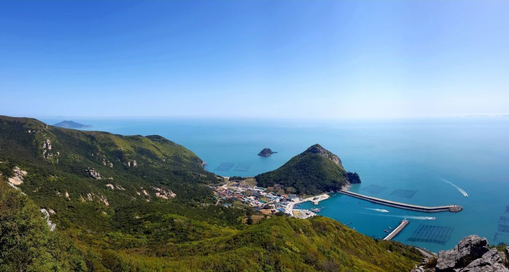 탐방로에서 내려다본 보길 보옥리 마을 전경과 보죽산 (사진제공=완도군)