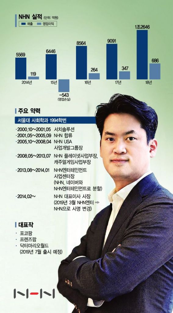 ◆19년째 NHN 지킨 '끈기'의 아이콘 = 정 대표한테는 끈기 있고 뚝심이 있다는 수식어가 따라붙는다. NHN에 몸 담은지 19년째. 이직이 잦은 정보기술(IT) 업계에선 이례적이다. 서울대 사회학과를 졸업한 뒤 이준호 NHN 회장이 2000년에 만든 검색엔진 개발업체 서치솔루션에 합류했다. 2001년 서치솔루션이 NHN에 합병되면서 'NHN맨'이 됐다. 이후 사업개발그룹장, NHN 플레이넷사업부장, 캐주얼게임사업부장, 사업센터장 등을 거쳤다. NHN이 네이버와 NHN엔터테인먼트(현 NHN)로 나뉜 때도 그는 NHN을 택했다. 이후 2014년 39세의 나이로 대표이사에 취임, 현재까지 NHN을 이끌고 있다.
