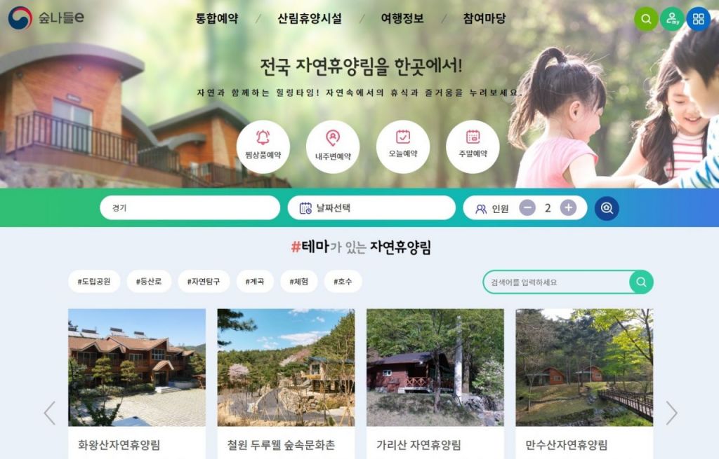 ‘숲나들e’는 우선 유명산, 천보산, 팔공산 등 58개 국·공립자연휴양림(국립 42개소, 공립 16개소)의 예약·결제를 원스톱으로 진행할 수 있게 한다.