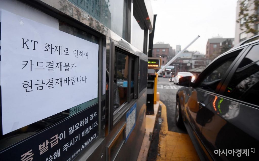 지난해 11월25일 서울 서대문구 이화여대 후문 차량출입구에 전날 발생한 KT아현지사 화재로 인한 카드결재불가 안내문이 붙어 있다. KT는 이날 오전 11시 기준 무선통신은 60%, 인터넷은 80% 복구됐으며 오늘 저녁 90%까지 복구할 것으로 예상했다./김현민 기자 kimhyun81@