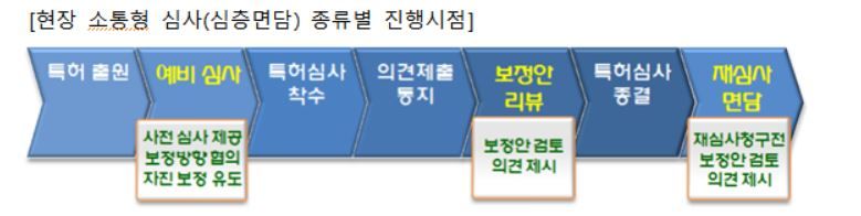 현장 소통형 심사는 특허 심사가 시작되기 전 사전 심사결과를 설명하는 ‘예비심사’, 심사관이 통지하는 통지한 거절이유를 토대로 보정방안을 상담하는 ‘보정안 리뷰’, 이미 거절 결정한 특허를 다시 심사하는 재심사 청구 전에 보정방안을 상담하는 ‘재심사 면담’ 등으로 구분된다.
