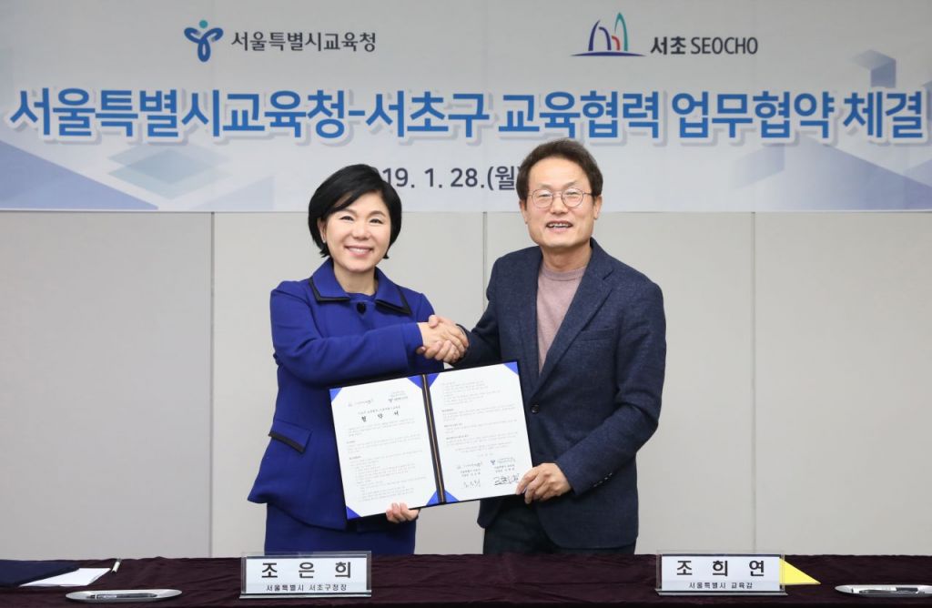 조은희 서초구청장이 조희연 서울시 교육감과 지난 1월28일 업무협약을 맺고 기념사진을 촬영하고 있다.