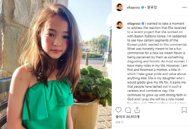 2일 엘라 그로스의 어머니는 딸의 SNS를 통해 “최근 엘라가 베스킨라빈스 코리아와 작업한 광고에 대한 반응을 언급하고 싶다”고 말문을 열었다.