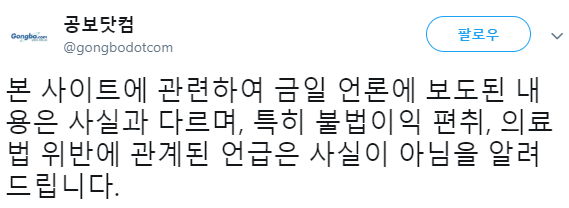 논란이 확산하자 '공보닷컴' 측은 공식 트위터를 통해 "본 사이트에 관련하여 금일 언론에 보도된 내용은 사실과 다르며, 특히 불법이익 편취, 의료법 위반과 관계된 언급은 사실이 아님을 알려드린다"고 밝혔다.