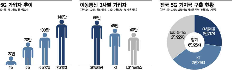 ◆ 5G 100일, 가입자 140만명 넘어서= 10일 과학기술정보통신부(이하 과기정통부)에 따르면 오는 11일로 상용 서비스 100일을 맞는 5G 가입자 수가 140만명으로 집계됐다. 현 증가 속도를 감안하면 연말까지 목표로 삼은 300만명은 거뜬히 넘어설 것으로 보인다. 이통사별로는 SK텔레콤이 55만명, KT가 45만명, LG유플러스가 40만명 정도다. 증가 추이를 보면 4월초 27만명에 불과했던 5G 가입자는 5월 70만명, 6월 100만명을 돌파한데 이어 7월10일 기준으로 140만명을 기록했다. 매달 가입자 증가폭이 30만~40만명을 유지하는 것이다. 이같은 속도라면 연말께 300만명을 무난히 돌파하게 된다. 이동통신업계 관계자는 "5G 개통 초기에는 이통사들이 보조금을 확대하는 등 가입자들을 쟁탈하기 위한 출혈 경쟁이 심했다"면서 "100일을 기해 하반기가 시작됐고 앞으로는 콘텐츠 확보나 품질 고도화가 관건이 될 것"이라고 말했다.