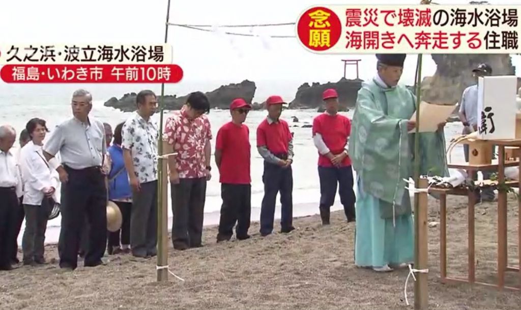 2011년 후쿠시마 원전사고 이후 9년만에 재개장한 이와키시의 히사노하마 해수욕장에서 13일 안전기원제를 벌이는 모습.(사진=TV아사히 뉴스 장면 캡쳐/news.tv-asahi.co.jp)