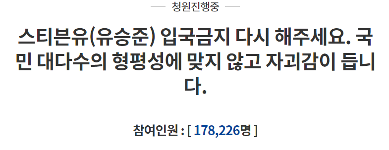 지난 11일 청와대 국민청원 게시판에는 "스티븐유(유승준) 입국금지 다시 해주세요. 국민 대다수의 형평성에 맞지 않고 자괴감이 듭니다"라는 제목의 청원글이 게시됐다.