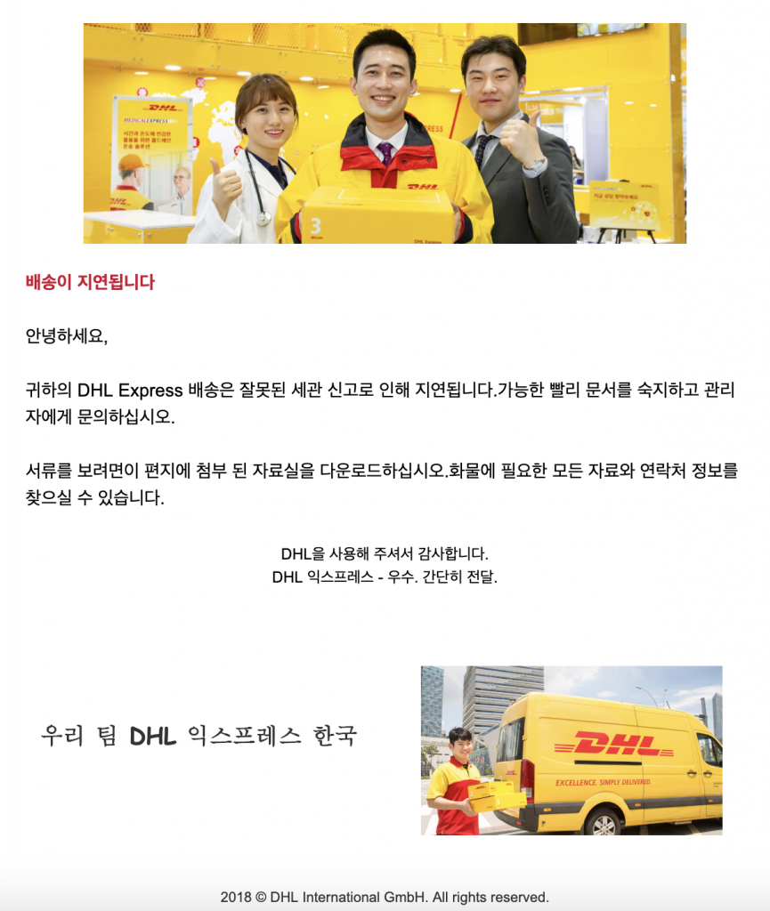 [아시아경제 유병돈 기자] '귀하의 DHL Express 배송은 잘못된 세관 신고로 인해 지연됩니다. 서류를 보려면 첨부된 자료를 다운로드하십시오.'