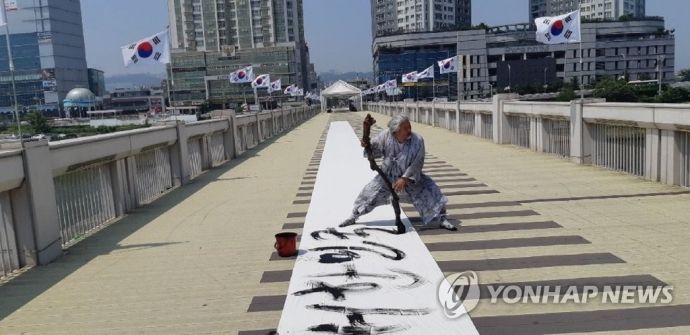 김동욱 서예가가 지난해 7월17일 울산교 위에서 제헌절 기념 서예 퍼포먼스를 펼치고 있다./사진=연합뉴스