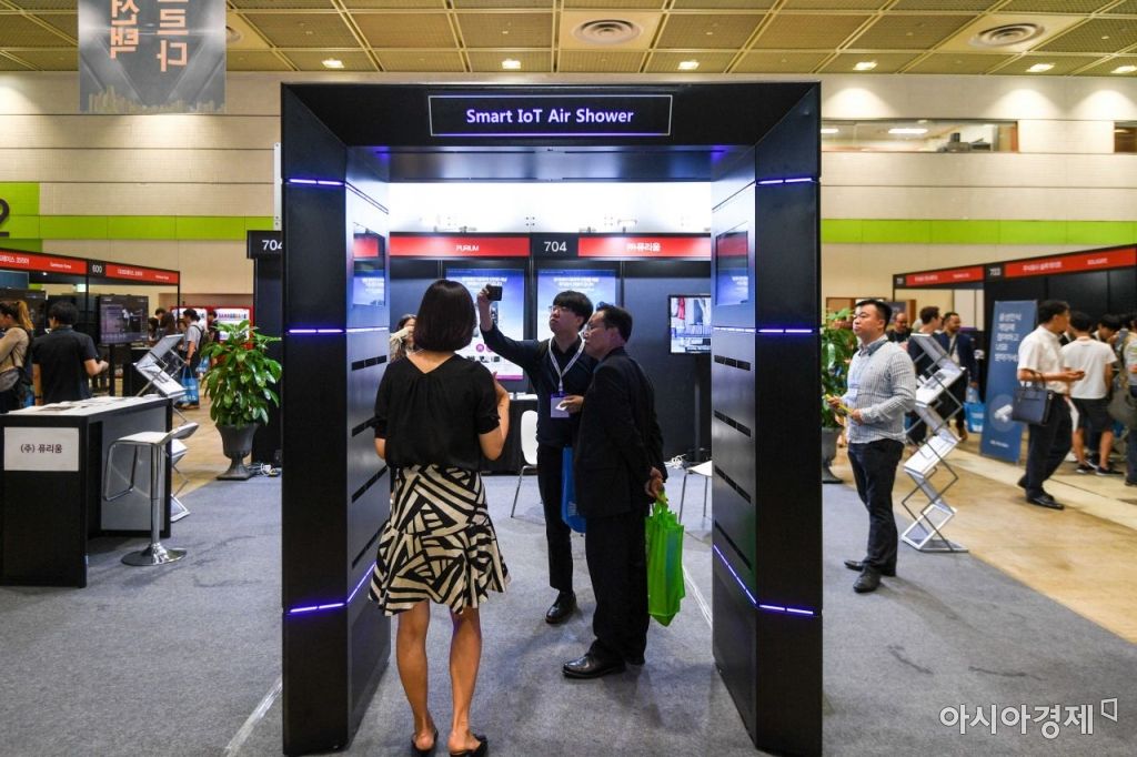 17일 서울 강남구 코엑스에서 열린 국제인공지능대전에 참가한 관람객들이 스마트 에어 샤워를 체험하고 있다./강진형 기자aymsdream@