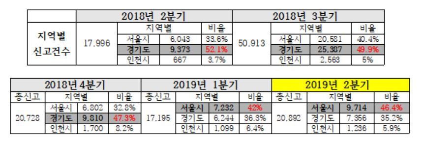 지역별 신고건수를 보면 서울시가 9714건으로 전 분기(7323건)에 이어 2분기 연속 1위를 기록했다. 경기도는 올 1분기(6244건)보다 소폭 상승한 7356건을 기록하며 2위를 기록했다. 3위 인천시의 신고량 역시 전 분기(1099건) 대비 소폭 상승한 1236건으로 집계됐다.