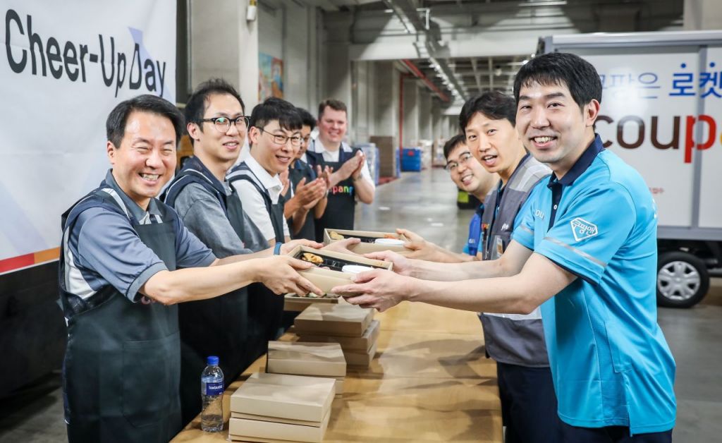 쿠팡 고명주 인사부문대표(왼쪽 첫번째) 등 임직원들이 쿠팡맨들에게 식사를 건네고 있다.