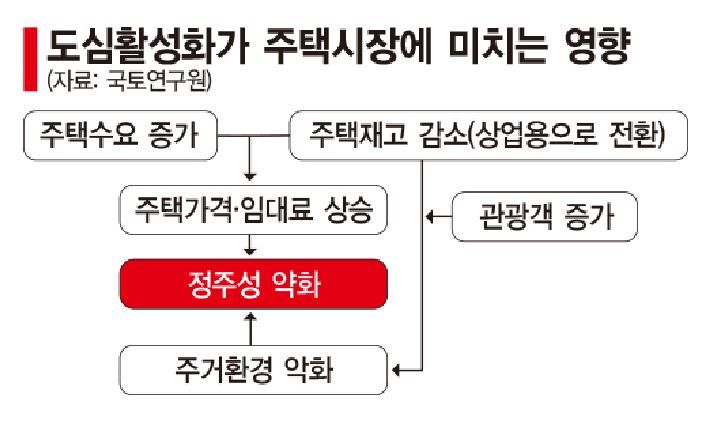 전문가들은 이 같은 도심활성화의 부작용 문제를 주택정책 프로그램으로 완화시켜야 한다고 조언하고 있다. 박천규 국토연구원 부동산시장연구센터장은 "지역자산을 통해 도심을 활성화하거나 관광자원으로 이용할 경우 반드시 주거환경 개선을 위한 사업을 병행해 정주성 약화를 선제적으로 방지하도록 유도해야 할 것"이라고 강조했다.