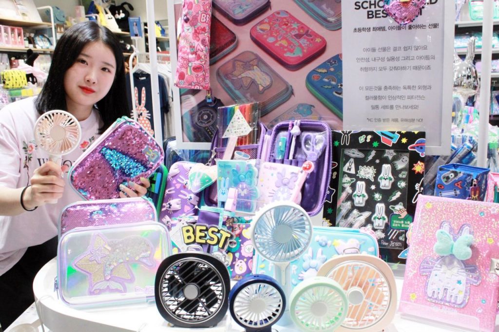 여름철 외출 필수품인 귀여운 휴대용 선풍기와 반짝이는 스팽글 소재의 화려한 하드케이스 필통을 비롯해 래시가드, 판초 가운과 같은 바캉스 용품이다.