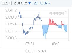 2019년 08월 01일 코스피 지수는 7.21p (0.36%) 하락한 2017.34로 마감했습니다.