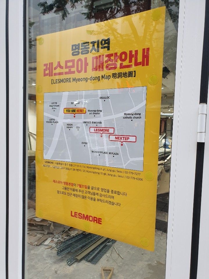 2일 관련 업계에 따르면 레스모아는 지난 21일부로 명동 1가 금강제화 소유 빌딩 1층에 입점해 있던 명동본점을 철수했다. 이에 따라 명동지역 매장은 기존 명동중앙점과 넥스텝 포함 3곳에서 2곳으로 줄었다. 넥스텝은 레스모아 매장 중에서도 스포츠 퍼포먼스에 특화된 점포다.