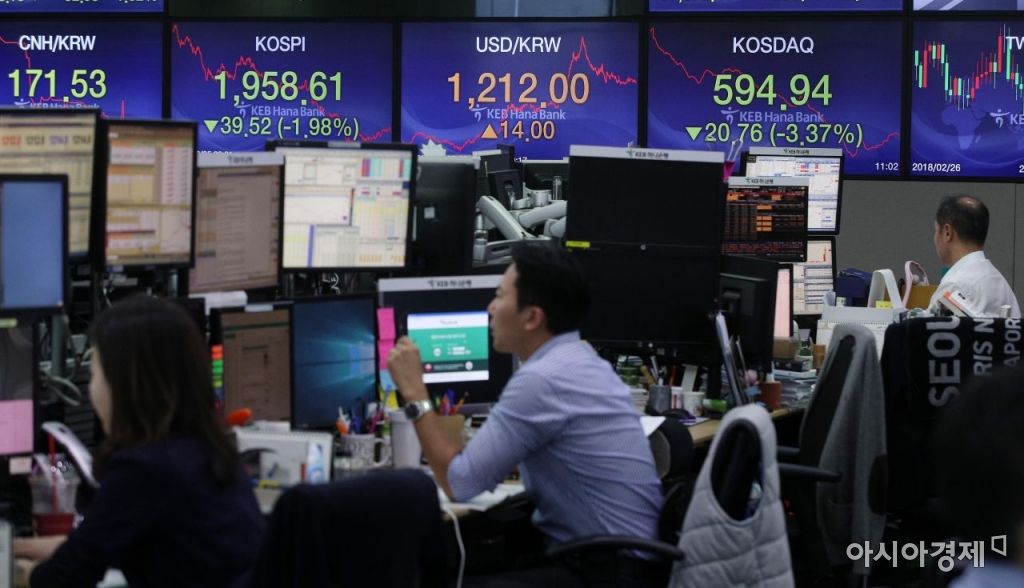 코스피 지수가 장중 1950선까지 하락한 5일 서울 중구 KEB하나은행 딜링룸에서 직원들이 업무를 보고 있다. 이날 코스피 지수는 장 초반 1% 넘게 하락하며 1950선까지 하락했고, 코스닥 지수는 2년 6개월여만에 600선 밑으로 하락했다./김현민 기자 kimhyun81@