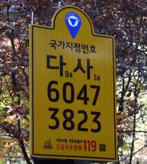 먼저 '국가지점번호판'을 알아야 합니다. 국가지점번호판은 행정안전부가 전 국토의 위치안내 및 표시방식을 통일해 재난이나 재해 등 긴급상황에서 신속한 위치안내와 인명구조 등에 활용하기 위해 제작된 것입니다.