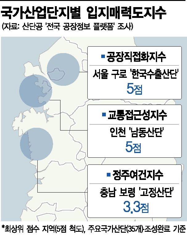 정주여건지수는 산단이 포함된 지방자치단체(시군구)의 경쟁력지수(KLCIㆍ2018년 기준) 중 정주여건지수가 높을수록 점수가 높다. 특히 서울 구로 한국수출산단의 정주여건지수 점수는 최하위 수준이었지만 공장직접화지수(2019년 7월 기준)는 최상위인 5점(5점 척도)을 기록했다. 공장직접화지수는 해당 산단에 특정 업종의 공장이 얼마나 많은지를 나타낸다. 공장이 많을수록 점수가 높다.